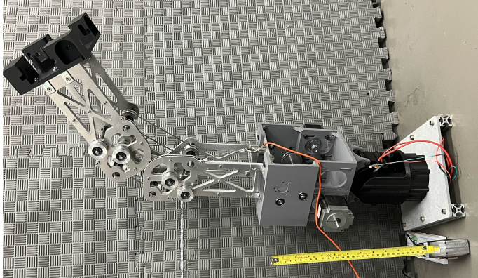 Early prototypes used 3D-printed linkages to enable rapid iteration, but testing revealed plastic deformation under cable tension. The final design replaces critical load-bearing components with waterjet-cut aluminum linkages, significantly improving stiffness and repeatability while preserving the weight advantages of cable-driven transmission. Steel shafts with machined grooves and retaining rings constrain pulley motion and reduce misalignment, further improving mechanical reliability.
